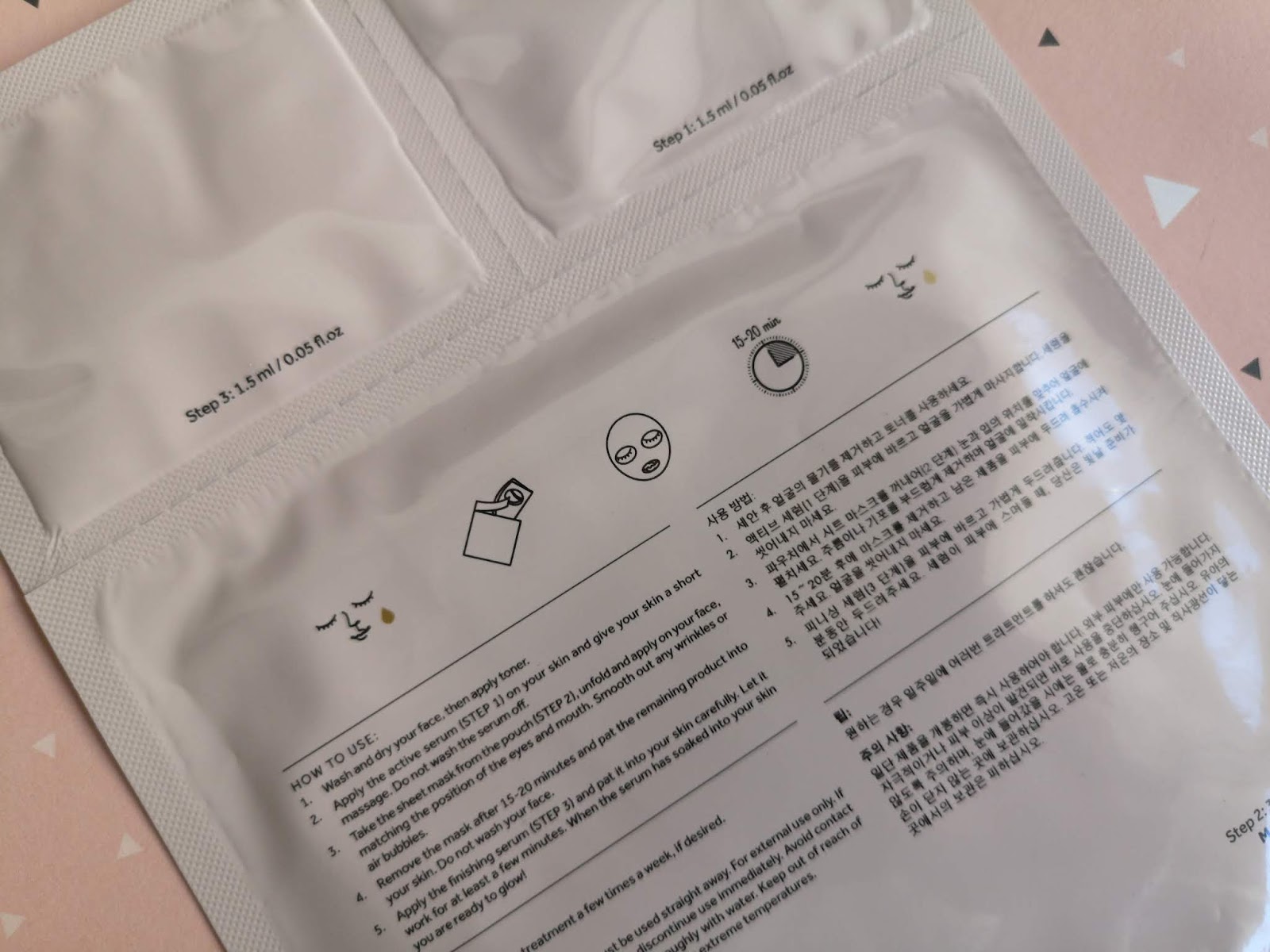 Míg a korábbi fátyolmaszkok kizárólag a maszkok csomagolásával rendelkezett, már amennyiben nem szettben veszi az ember, mert szettben egy szuper dobozba kerül. A 3in1 maszk kapott egy külső, karton borítást, gyönyörű dizájnnal, a hátulján plusz információkkal - használati útmutató részletesen, összetevők listája, ilyesmik. Egyébként imádom ezt a külsőt, azon túl, hogy a bőrünket kényeztetjük, miért ne kényeztethetnénk a szépérzékünket?